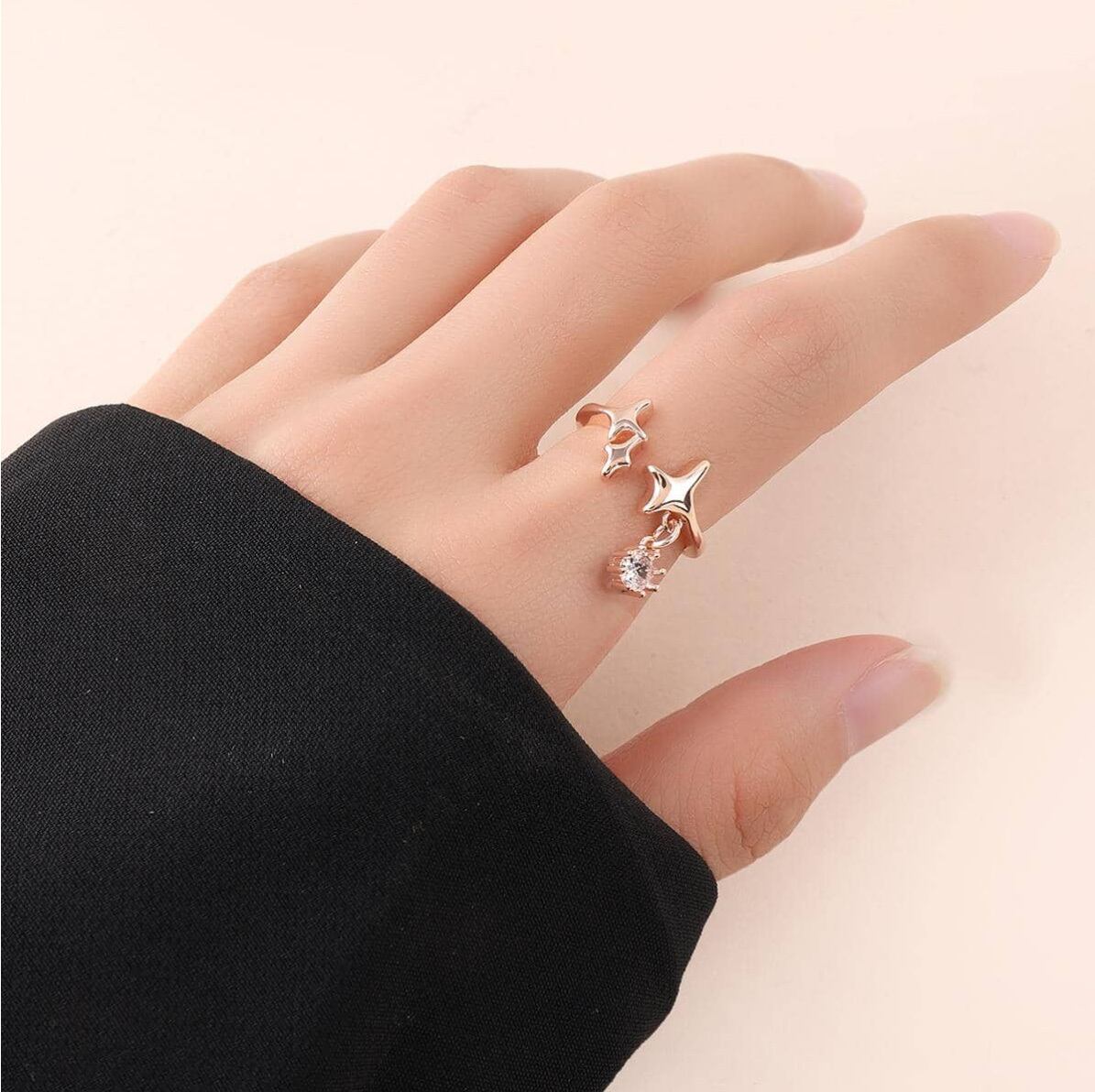 星形モチーフのゴールドリング、ストーン付きでカジュアルに最適。