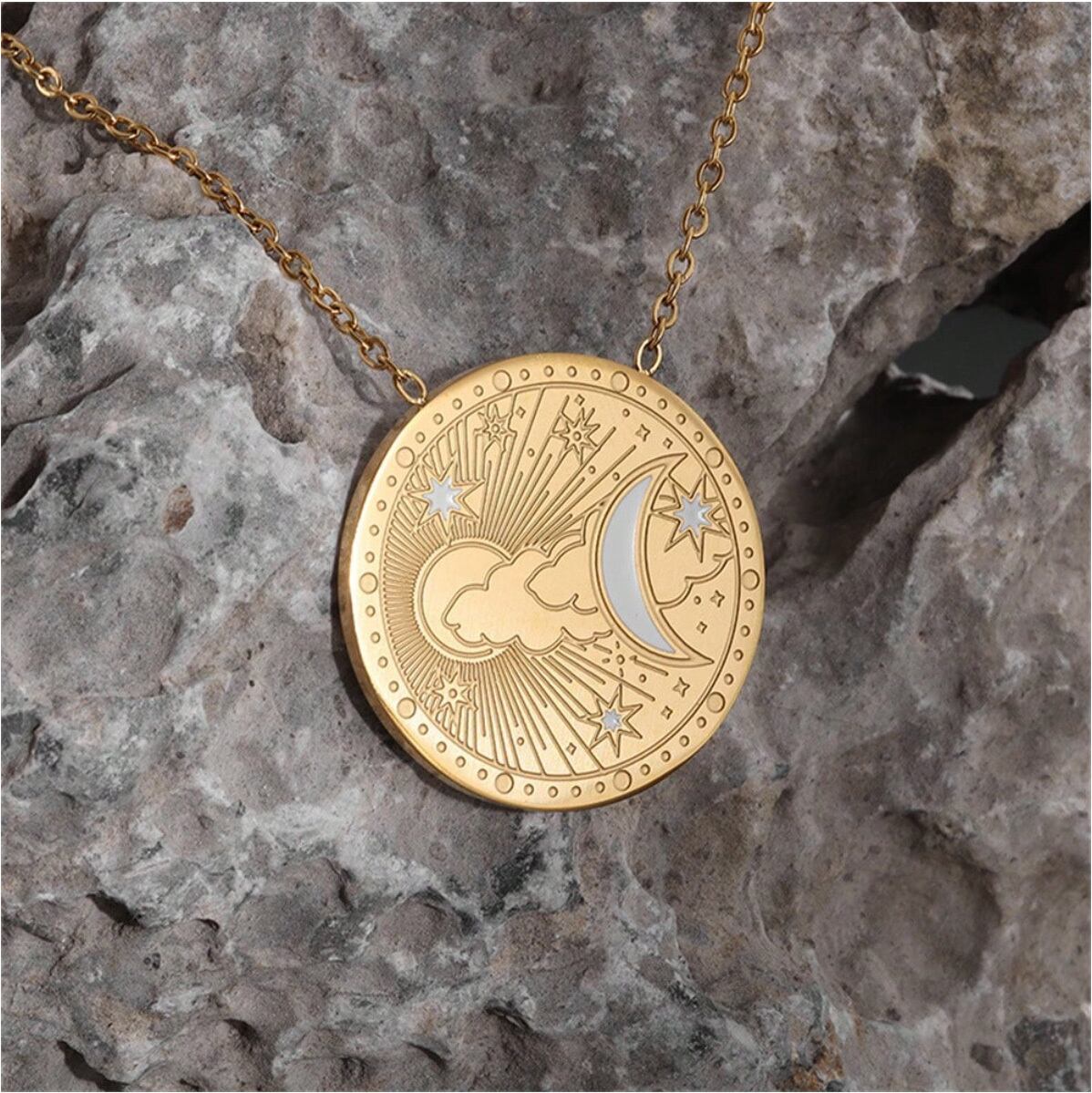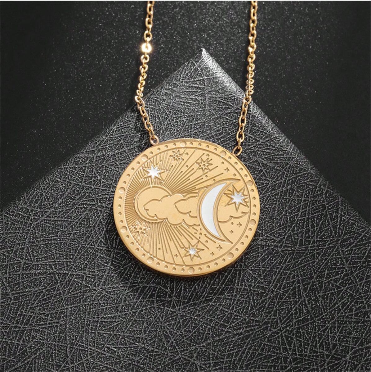 月と星のデザインが魅力的なステンレス製ネックレス。シンプルながらも存在感があり、デイリーコーディネートにピッタリです。