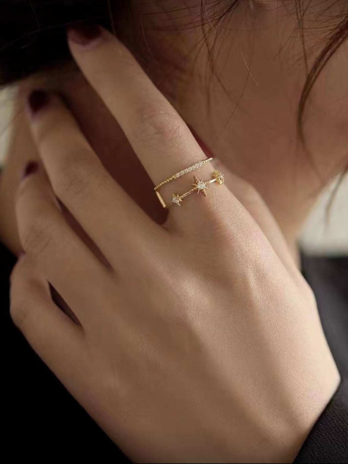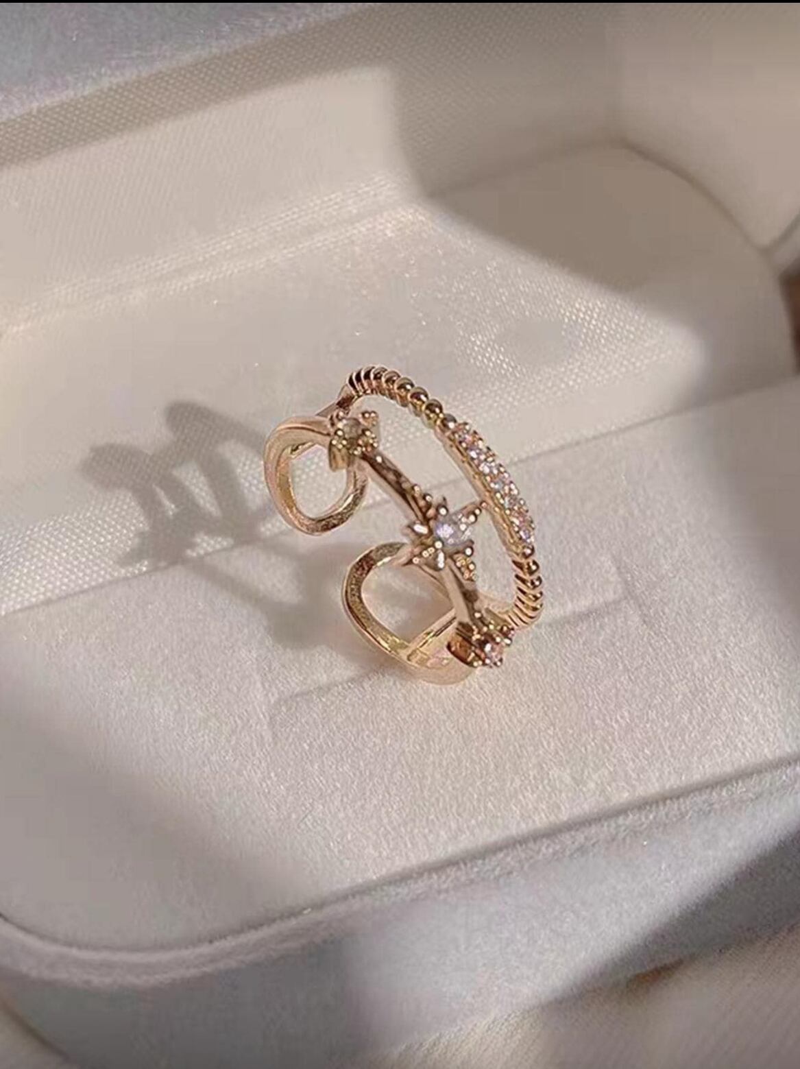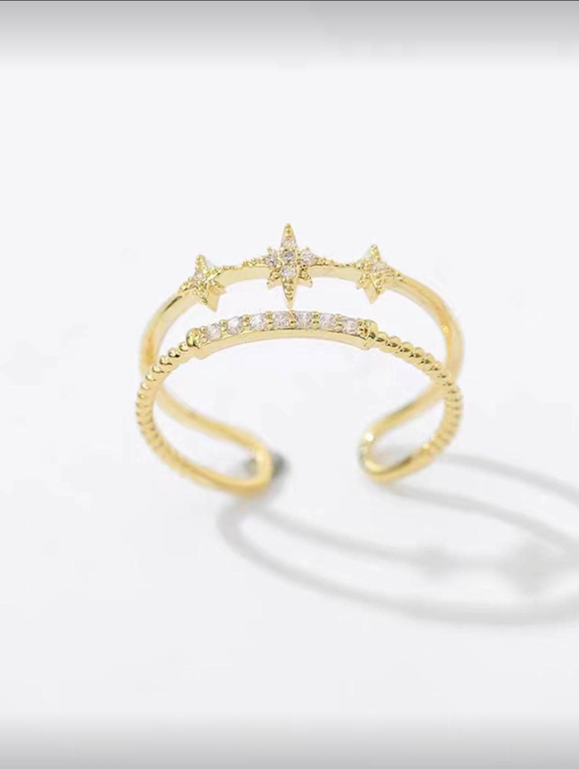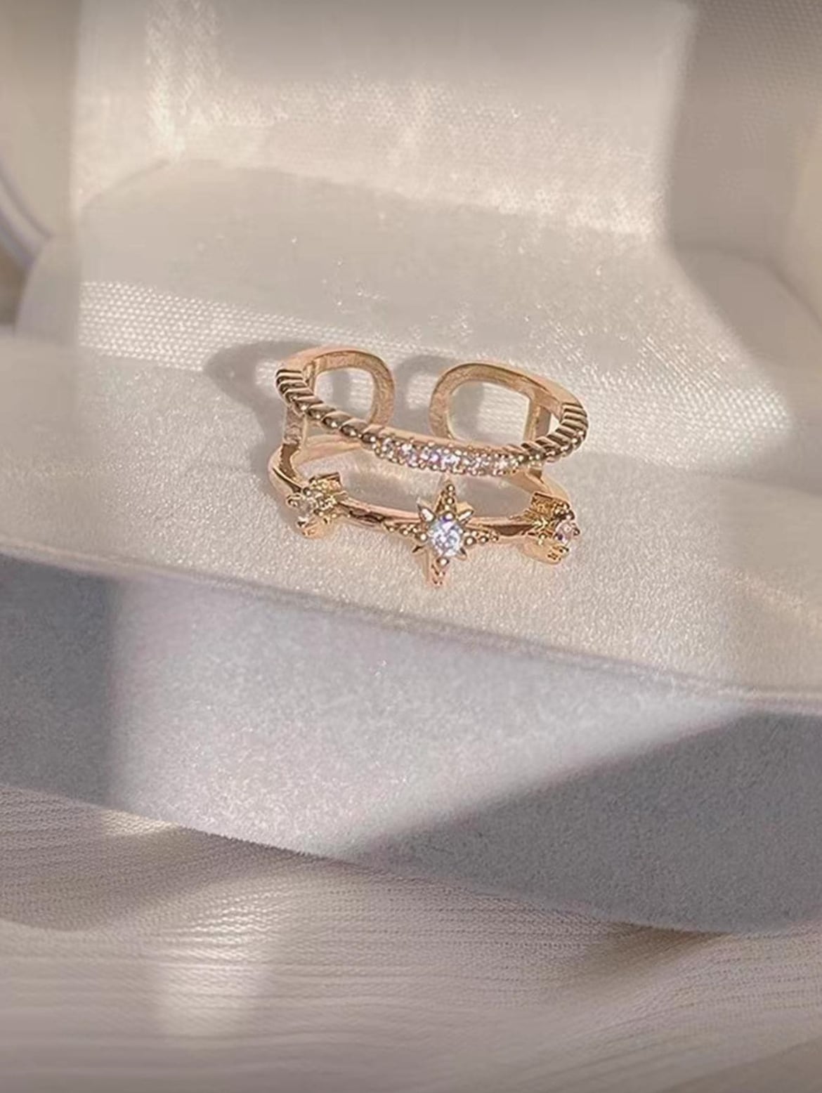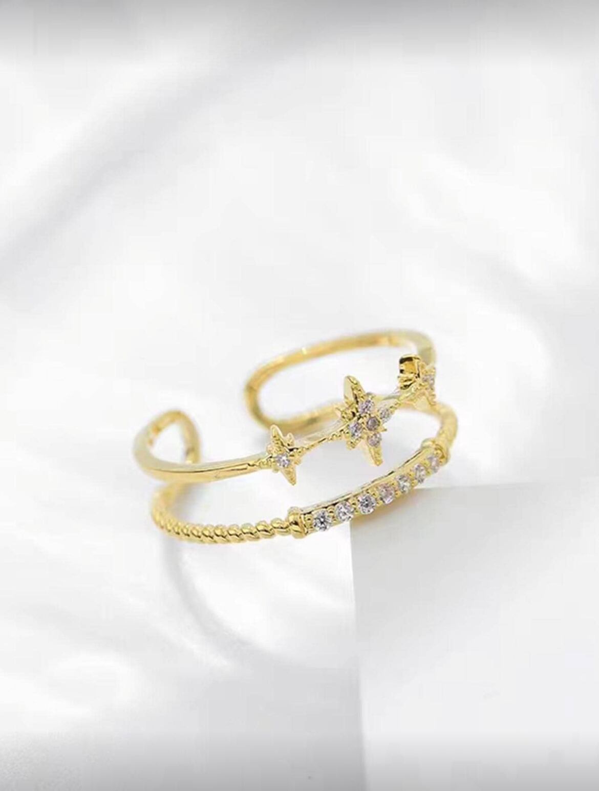 星形の華やかなデザインと輝くクリスタルが、指元を美しく彩ります。デイリーコーディネートにも、特別なお出かけにも最適な一品です。