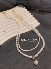 エレガントなダブルレイヤーのホワイトパールネックレス、中央に大きなパールとクリスタル装飾。