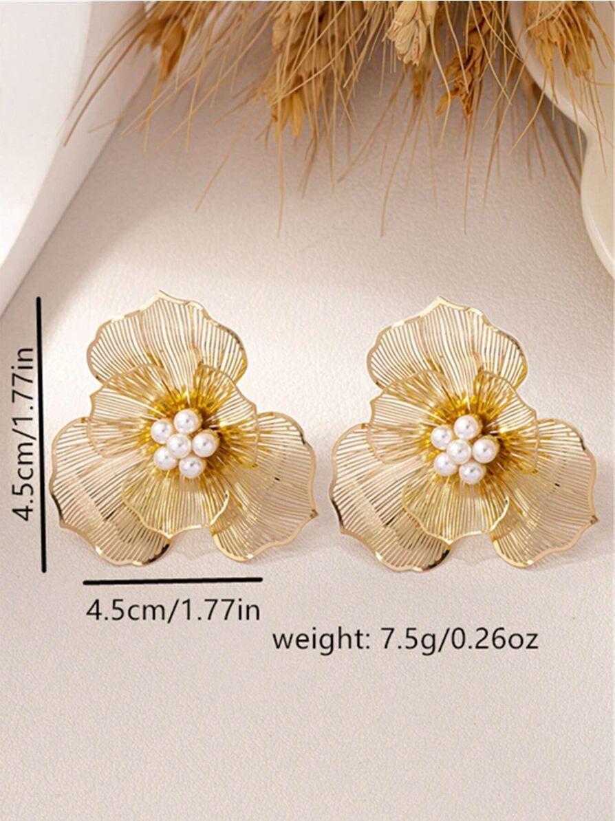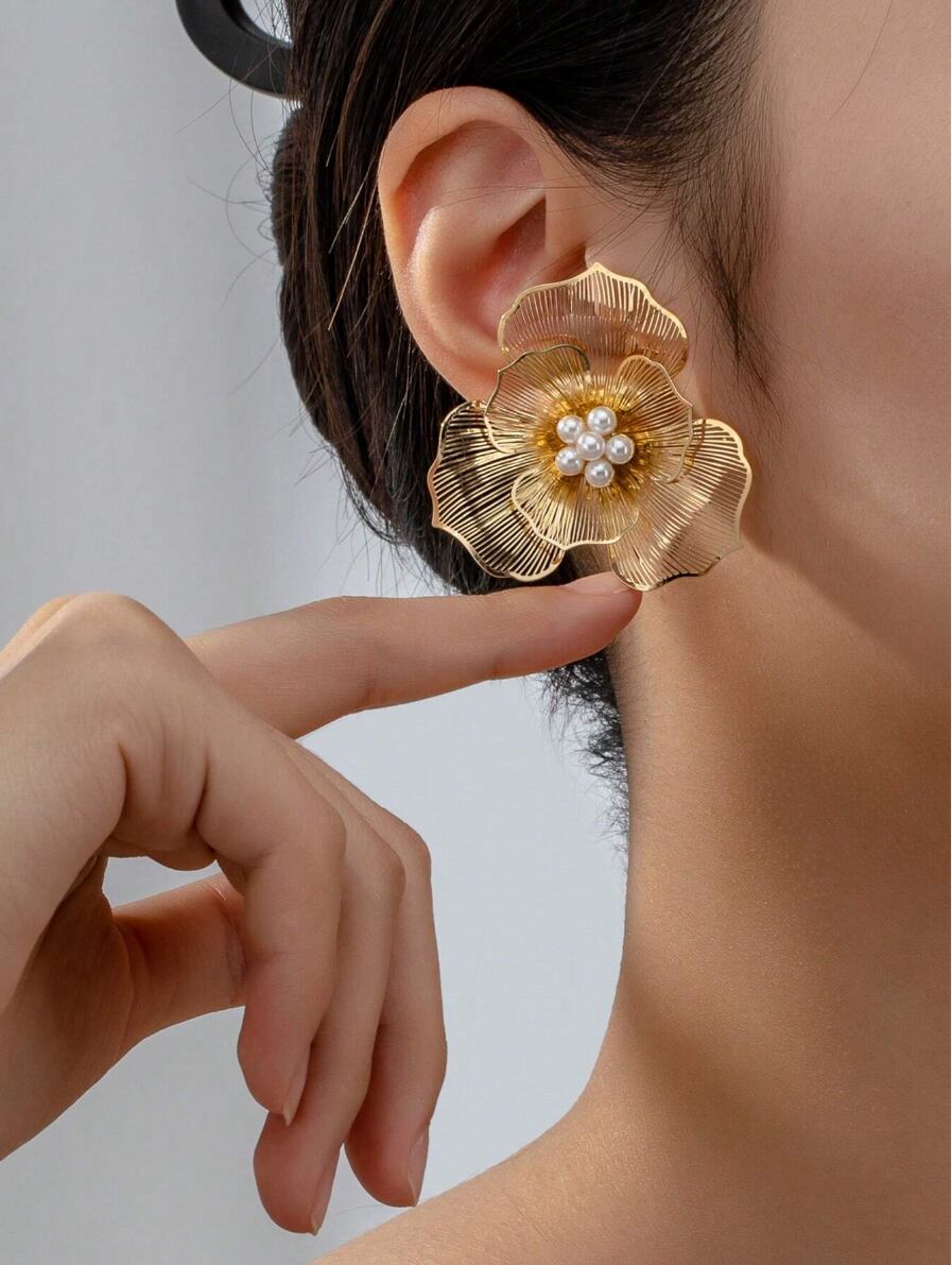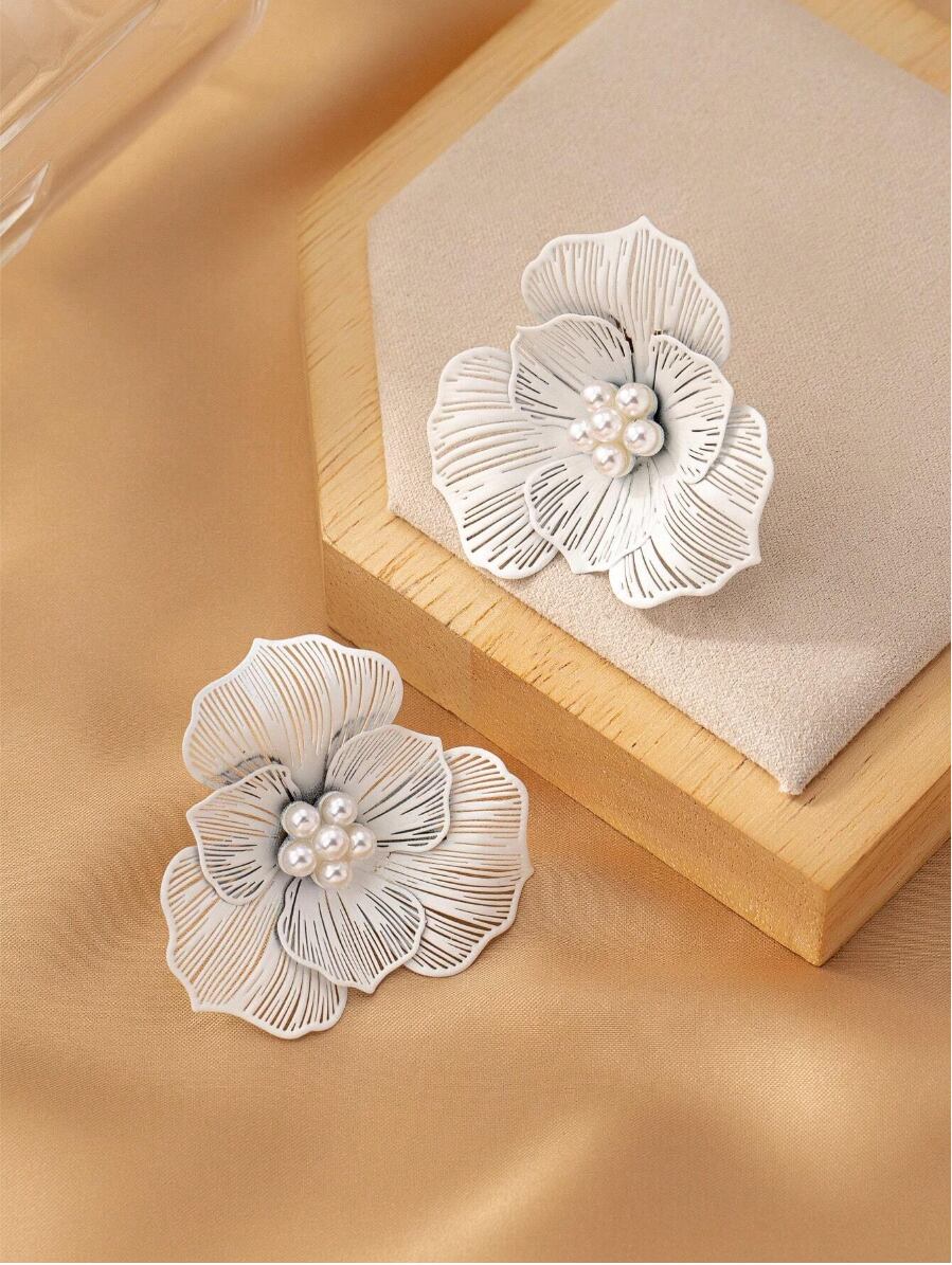 華やかな花モチーフのピアスで、パール装飾が魅力的です。