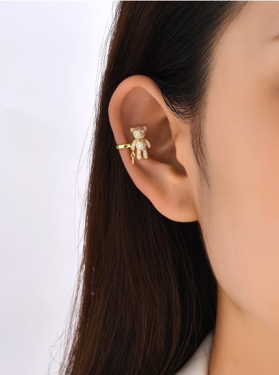 クリスタル装飾のクマデザインのイヤーカフ、個性的でファッション性抜群。